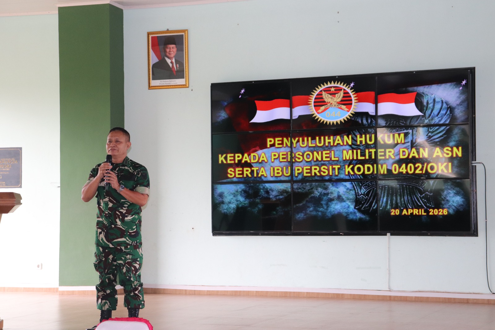 Ogan Komering Ilir, 20 April 2026 – Dalam rangka meningkatkan pemahaman dan kesadaran hukum bagi prajurit, Aparatur Sipil Negara (ASN), serta anggota Persit Kartika Chandra Kirana (KCK), Kodim 0402/OKI-OI menggelar kegiatan penyuluhan hukum yang dilaksanakan di Aula Darmawangsa Kodim 0402/OKI-OI, Senin (20/04/2026).